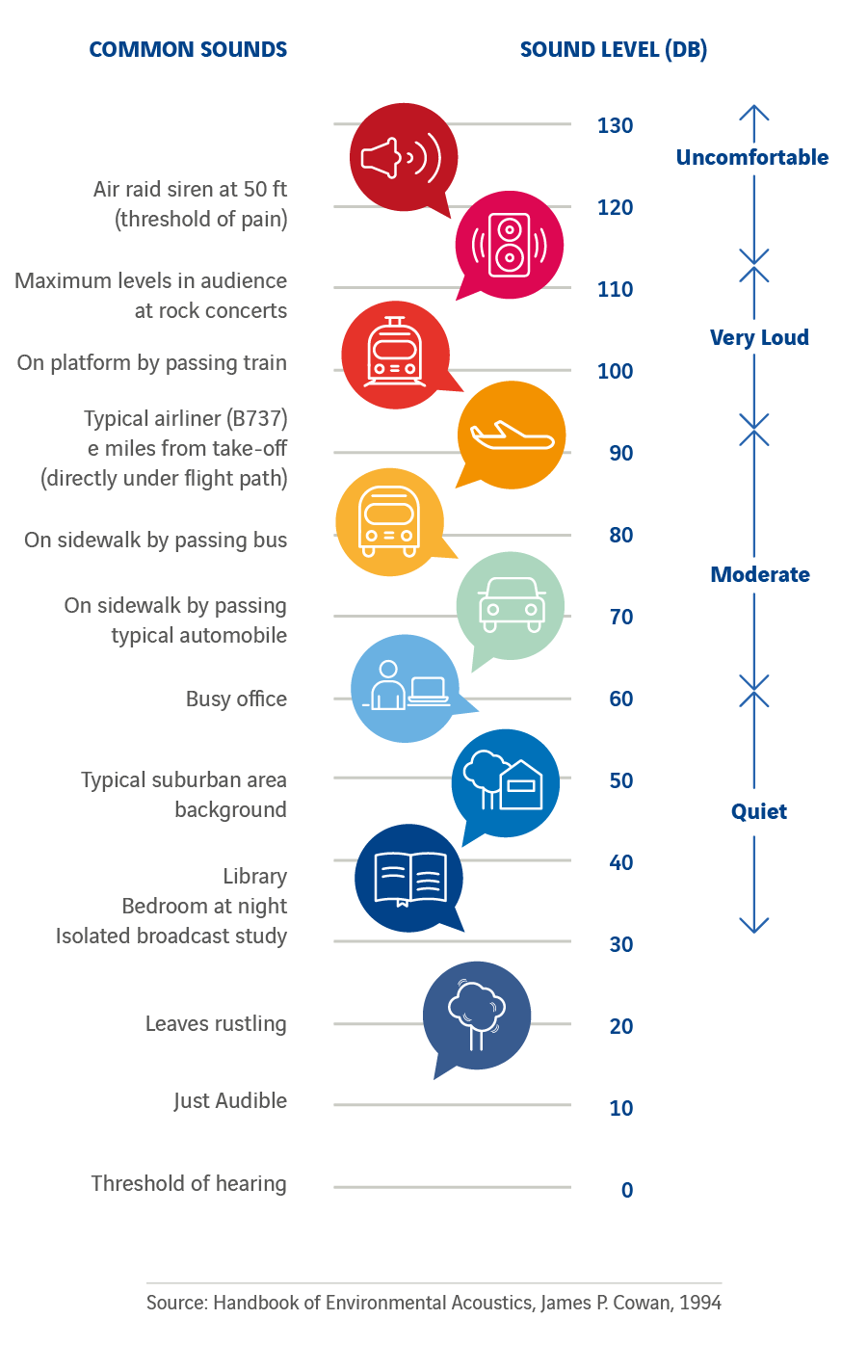Sound levels are measured in decibels (dB), on a logarithmic scale, where 0 dB is considered to be the "threshold of hearing" (the minimum noise a human being is capable of hearing) and 120 dB is the "threshold of pain" (the level from which the human ear begins to suffer physical damage.)