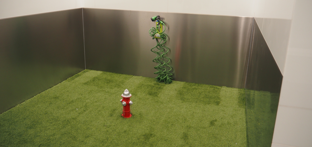 Con zona de agua y lavado, césped sintético, dispensadores de bolsas y decoración adecuada.