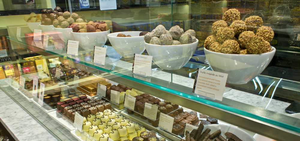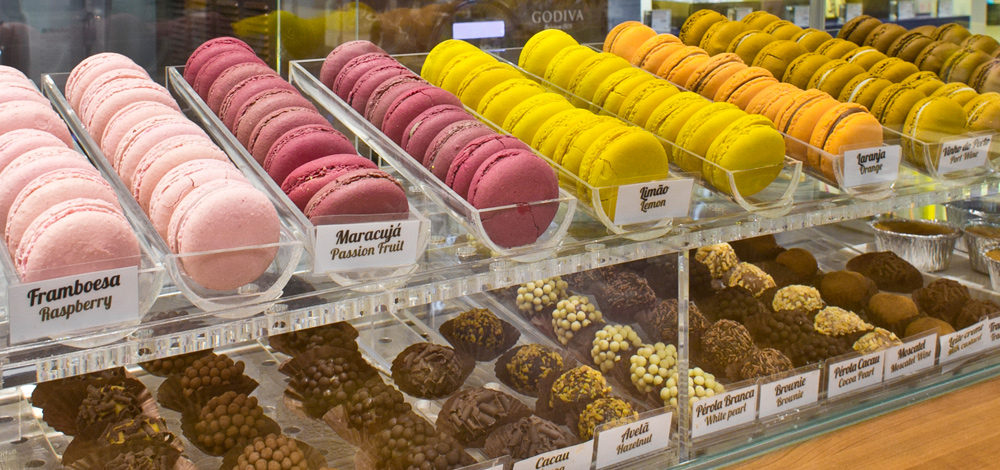 Impossível resistir à tentação neste espaço dedicado às melhores marcas de chocolataria do mundo: Godiva, Neuhaus, Valrhona e Arcádia.