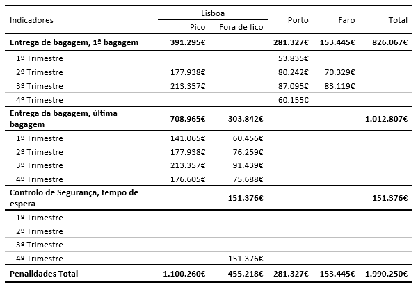 Em 2023, verificaram-se 17 incumprimentos nos Aeroportos de Lisboa, Porto e Faro que, no total, resultaram numa penalidade de 1.990.250 euros dividida da seguinte forma por aeroporto, trimestre e indicador: